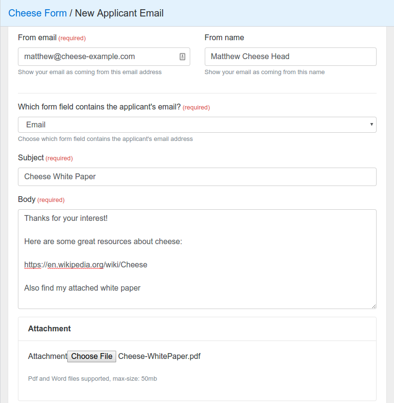 Then enter what ever text you’d like your email to contain. You can also set the from address and name. Importantly it allows you to upload an attachment, this is a great place to add your white paper!