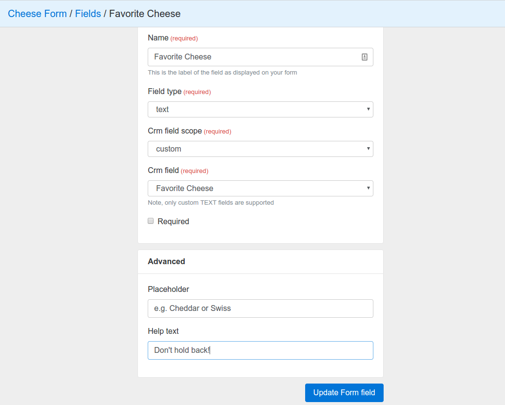 In this example I’m prompting the user to give me contact details in exchange for a white paper on cheese. To better qualify them I also ask them to tell me their favorite cheese, which I map to a custom column in my Close account: